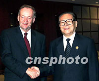 10月20日,中國(guó)國(guó)家主席江澤民在上海會(huì)見(jiàn)加拿大總理讓·克雷蒂安。中新社圖