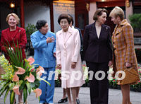 出席APEC會(huì)議的經(jīng)濟(jì)體領(lǐng)導(dǎo)人配偶二十日在上海豫園游覽,中國(guó)國(guó)家主席江澤民夫人王冶坪(左二)與澳大利亞霍華德總理夫人珍妮特·霍華德(左一)、韓國(guó)總統(tǒng)金大中夫人李姬鎬,加拿大克蕾蒂安總理夫人艾琳·克蕾蒂安和俄羅斯總統(tǒng)普京夫人柳德米拉·普京(左至右)等在一起合影留念。中新社記者 王瑤 攝