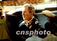 美國總統布什身穿藍色中式對襟服裝走出特制專用轎車,出席二十一日的上海APEC峰會。中外記者聚集在現場直播的電視屏幕前,進行同步報道。中新社記者 賈國榮 攝