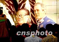 十月二十一日清晨,中外記者聚集在上海國際新聞中心現場直播的電視屏幕前,關注中國國家主席江澤民身著紅色中式對襟服,迎接身穿藍色中式對襟服的美國總統布什,進行出席上海APEC峰會。中新社記者 賈國榮 攝