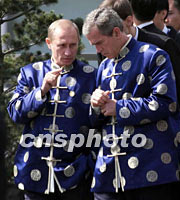 10月21日,出席亞太經合組織領導人非正式會議的俄羅斯總統普京和美國總統布什在會議間隙交談。中新社圖