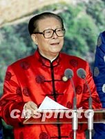 10月21日,國家主席江澤民在上海科技館宣讀亞太經合組織第九次領導人非正式會議的《領導人宣言》。中新社圖