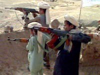 面對美軍和北方聯盟的兩面夾擊,塔利班武裝日前積極調整地面部隊的部署和戰士的武器配備。圖為簡單掩體里訓練的塔利班“童子軍”。