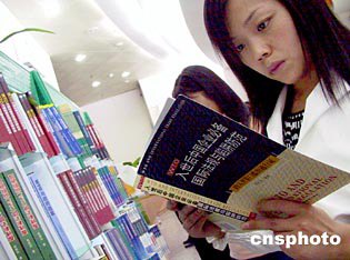 北京一位女士十九日在北京圖書大廈聚焦WTO書架前瀏覽有關中國入世的書籍。隨著中國入世日期的日益臨近,北京市民紛紛通過各種手段了解入世知識。到十月底前,北京市將有八點三萬人通過WTO相關知識的培訓考試。中新社圖 武仲林 攝