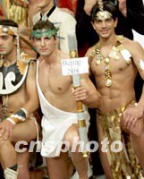 頭戴橄欖枝、手持奧林匹克火炬的希臘男模(中)八日晚在北京東方花園展示民族服裝,角逐本屆男模大賽最佳民族服飾獎(jiǎng)。世界唯一專業(yè)性的國(guó)際男模賽事夏蒙 2001 Manhunt世界男模大賽總決賽日前在北京舉行,共有來(lái)自世界四十一個(gè)國(guó)家的男模參加這項(xiàng)賽事。中