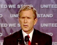 美國總統布什八日在黃金時間從阿特蘭大發表全國講話。他說,一個四歲的小女孩曾給他寫信問:“那些人都不知道我們是誰就攻擊我們。我們干嘛不告訴他們我們叫什么呢?”布什接著說:“我們會告訴那些恐怖分子我們是誰的,我們會告訴他們美國是誰。”布什的講話引來在場五千名聽眾起立鼓掌。今晚,布什講話三十二分鐘,被掌聲打斷二十五次。