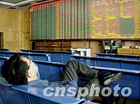 十一月九日是中國加入WTO前的最后一個股市交易日,福州股民平靜對待振蕩的股市。圖為福州股民在股市中睡大覺。中新社圖 華小銳 攝