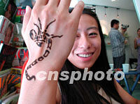 一位北京小姐周末到尚吉體繪店請人在她手背繪上毒蝎圖案,據店員介紹這種毒蝎標志在京城時尚美女中頗為流行。中新社圖 陳峰 攝