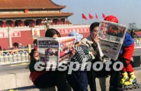 十一日是中國入世的第一天。在天安門廣場上游玩的一家人仔細閱讀當日報紙關于WTO的相關新聞。中新社記者 史利 攝