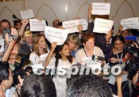 正在多哈舉行的第四屆WTO部長會議會場外上,一些非政府組織成員十一日舉著標語示威呼喊“民主、公正”等口號。中新社記者 錢興強 攝