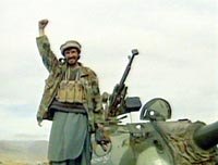 阿富汗北方聯(lián)盟一名士兵十二日在坦克上歡慶勝利。阿富汗北方聯(lián)盟日前氣勢(shì)如虹,繼奪取北部重鎮(zhèn)馬扎里沙里夫和北部四個(gè)省份后,宣稱(chēng)又攻占了前首都塔盧坎。