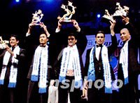 夏蒙2001世界男模大賽十二日晚在北京保利劇院落下帷幕,包括冠亞軍在內(nèi)的十七個(gè)獎(jiǎng)項(xiàng)各有其主。圖為獲得本屆男模大賽前五名的選手。從左至右依次為委內(nèi)瑞拉(季軍)、中國(亞軍)、印度(冠軍)、克羅地亞(第四名)和開曼群島(第五名)選手。中新社圖