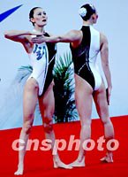 兩名江蘇美女身著雅致的黑白泳裝,胸前背后銹著中國書法“劍”字,極富魅力地展現(xiàn)在十一月二十二日的廣州九運(yùn)會花樣游泳比賽中。中新社記者 賈國榮 攝