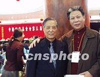 中國電影基金會第三屆理事會第一次年會24日上午在海口開幕。曾在《大決戰》、《開國大典》、《劉少奇的四十四天》等影片中成功扮演劉少奇的著名特型演員郭法曾出席了開幕式。圖為郭法曾(右)與電影基金會秘書長王云人(左)在開幕式現場合影。中新社記者 王辛莉 攝