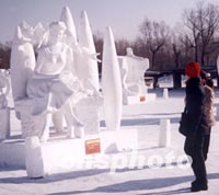 哈爾濱太陽島元月又成雪雕世界,主題從著名建筑到花鳥風景,名目繁多。圖為觀眾認真觀看一組名為“一切為了愛”的雪雕。中新社圖 赫重運 攝