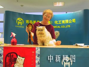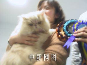 在波斯貓比賽中,一只乳黃色的波斯貓榮獲三項大獎。