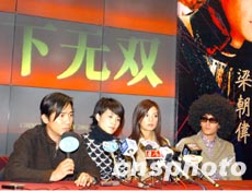 香港新“影帝”梁朝偉、“歌后”王菲、“小燕子”趙薇、臺灣影星張震,2月3日聯手在香港推介他們四人合作拍攝的電影《天下無雙》。中新社傳真 任晨鳴 攝