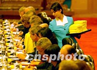 一名北京人民大會堂的服務員,二十一日中午向出席中美首腦會談的布什總統送上熱毛巾。中新社記者 賈國榮 攝