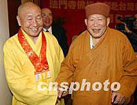 法門寺佛指舍利赴臺供奉新聞發布會,日前在西安喜來登大酒店舉行,中國佛教協會等有關人士和臺灣佛教人士以及來自大陸、港臺的眾多記者參加了發布會。圖為臺灣惟覺法師與法門寺凈一方丈在發布會上。中新社記者 錢興強 攝