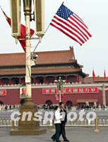 美國總統布什訪華第二日,天安門廣場中美國旗在陽光下招展飄揚,金水橋邊車水馬龍,一些游人以中美國旗為背景照相留影。許多市民對布什昨天關于“中美關系搞好了對世界都有益”的表述十分贊賞。中新社記者 王麗南 攝