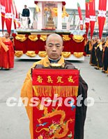 二十三日西安咸陽(yáng)機(jī)場(chǎng)法旗飄飄、云香繚繞,兩岸眾僧恭送法門寺佛指舍利赴臺(tái)灣地區(qū)瞻禮(供奉)。 中新社記者 錢興強(qiáng) 攝