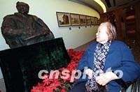 吳作人精品---暨吳作人基金會接受捐贈作品12日在北京中華世紀壇隆重開幕,展出吳作人畫作70余幅及海內外138位美術家捐贈的177幅作品,圖為吳作人先生的夫人著名畫家肖淑芳在吳作人先生的塑像前緬懷親人。中新社記者 張勤 攝