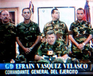 委內瑞拉當?shù)貢r間4月11日晚(北京時間12日上午),國民警衛(wèi)隊的卡伊魯茲將軍宣布,總統(tǒng)查韋斯的政府已經(jīng)"不再履行其職能",全國局勢已經(jīng)被軍隊控制。此前已有多名高級軍官宣布不承認總統(tǒng)查韋斯,并要求其下臺。圖為委內瑞拉軍隊司(中).(春風)