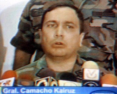 委內瑞拉當?shù)貢r間4月11日晚(北京時間12日上午),國民警衛(wèi)隊的卡伊魯茲將軍在當?shù)仉娨暸_宣布,總統(tǒng)查韋斯的政府已經(jīng)“不再履行其職能”,全國局勢已經(jīng)被軍隊控制。圖為卡伊魯茲將軍在電視臺講話時的電視截頻圖像。(春風)