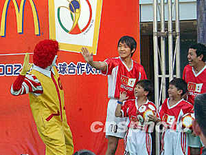 麥當勞日前在上海南京路世紀廣場舉行“體驗世足魅力,盡在麥當勞”系列活動。圖為“麥當勞叔叔”和以影星周星馳為首的小足球隊員在一起“比賽”。錢興強 攝