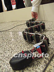 在京城五月舉行的“科技創造未來”大型科普展上,一條機器蛇引起了觀眾的關注。該機器蛇實現了像蛇一樣的“無肢運動”,被國際業界人士稱為“最富于現實的機器人”,并在輻射,有粉塵,有毒等惡劣環境中有廣泛的應用前景。章永哲 攝
