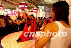一隊猛男靚女在五月北京國際科技產業博覽會上載歌載舞,為國產家電進軍世界市場助威。賈國榮 攝