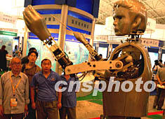 一位國產音樂迎賓機器人,在五月北京國際科技產業博覽會上亮相,它能指揮許多中外名曲向來賓致意。賈國榮 攝
