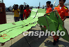 5月26日下午,搜索人員打撈出失事華航客機部分殘骸。中新社記者 任晨鳴 攝