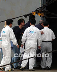 五月二十八日,臺灣飛行安全委員會陪同美國專家到澎湖馬公空軍基地檢查打撈起的飛機殘骸。中新社記者 任晨鳴 攝