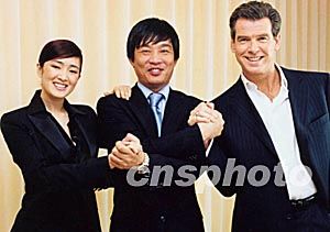日前,中國著名西服品牌"夏蒙"公司,特邀美國好萊塢著名影星皮爾斯·布魯斯南(右)與中國著名影星鞏俐(左)聯手在倫敦為該品牌拍攝廣告片。圖為"夏蒙"服飾公司董事長陳孝祥先生(中) 與明星們一起祝廣告拍攝成功。東方 攝