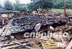 福建省明溪縣遭受“六·一六”暴雨襲擊后,全縣農(nóng)村民房共倒塌一千八百余間,損壞一千二百間。圖為該縣災(zāi)民在清理倒塌房屋,重建家園。作者:黃秋榮