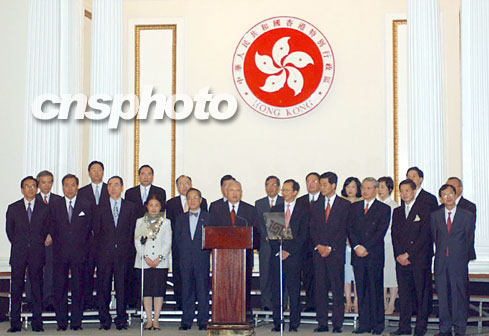 董建華與“新內閣”拍攝全家福。香港特首董建華6月24日在香港禮賓府宣布二十一名“新內閣”成員名單后,與將肩負重任的高官拍攝全家福。中新社傳真任晨鳴攝