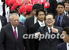 行政長官董建華7月1日帶領香港眾高官,在國際機場為國家主席江澤民送行。中新社圖 洪少葵 攝