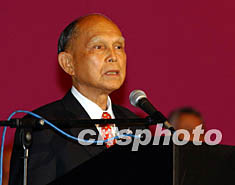 七月三日,香港廣東社團(tuán)總會在香港舉行慶祝香港特區(qū)政府成立五周年以及董建華連任第二屆特區(qū)政府行政長官聯(lián)歡宴會。該會總監(jiān)霍英東致詞。中新社圖潘索菲攝