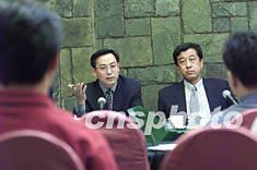 大陸臺灣問題專家辛旗(左)、李義虎等九日在北京就陳水扁“8.3”“臺獨”言論接受媒體聯合采訪。