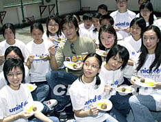 聯合國兒童基金香港會員會大使陳曉東8月13日在香港出席「UNICEF小熊穿梭全城Fun」慈善義賣活動記者會,陳曉東與一眾義工朋友烈日下一同參與品嘗「貧苦午餐」。鄧慶樂 攝