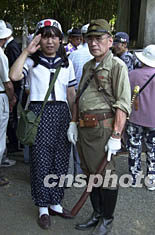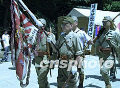 十五日是日本戰敗五十七周年紀念日,在供奉有二戰戰犯的的靖國神社前,一群穿著原“鬼子兵”軍服的人趾高氣揚地來回游走。陶光雄 攝