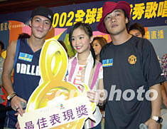 歌星陳奕迅、陳冠希8月15日在香港出席「2002全球華人新秀歌唱大賽(香港區選拔賽)」記者會,八位新秀會上為18日晚進行大賽作最后熱身,以勁歌熱舞展示實力,結果1號參賽者羅寶欣奪得「最佳表現獎」,歌星陳奕迅、陳冠希并向她頒獎鼓勵。鄧慶樂 攝
