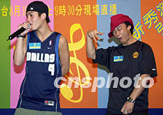 歌星陳奕迅、陳冠希8月15日在香港出席「2002全球華人新秀歌唱大賽(香港區選拔賽)」記者會,陳奕迅會上模仿陳冠希的臺風,頗為古怪有趣。鄧慶樂 攝