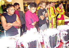 2002世界泰拳金腰帶慈善大賽組委會(huì)十六日在澳門舉行新聞發(fā)布會(huì),圖為會(huì)前參賽的各國選手觀看大賽的獎(jiǎng)杯。李剛 攝