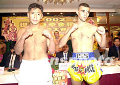 2002世界泰拳金腰帶慈善大賽組委會(huì)十六日在澳門舉行新聞發(fā)布會(huì),綽號“草原雄鷹”的中國選手格日樂圖(左)和對手在會(huì)上亮相。李剛 攝