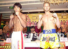 2002世界泰拳金腰帶慈善大賽組委會(huì)十六日在澳門舉行新聞發(fā)布會(huì),綽號“怪俠三毛”的中國選手王三楨(左)在會(huì)上與對手共同亮相。李剛 攝