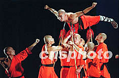 二十一日晚由中國(guó)對(duì)外演出公司和嵩山少林寺主辦的“少林雄風(fēng)”演出在北京天橋劇場(chǎng)上演。少林武僧表演了十八般武藝,并以舞美展示了和尚的四季生活。童曙泉 攝