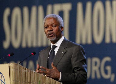 姆貝基、安南、第五十六屆聯(lián)大主席韓升洙先后在開(kāi)幕式上致辭。安南在講話中呼吁,國(guó)際社會(huì)特別是發(fā)達(dá)國(guó)家應(yīng)該為地球、為未來(lái)負(fù)起責(zé)任。他說(shuō),本次會(huì)議的重點(diǎn)集中在人類(lèi)與自然資源的關(guān)系上。目前,氣候變化、污染、漁業(yè)資源的損耗等環(huán)境問(wèn)題已經(jīng)讓人無(wú)法視而不見(jiàn)。