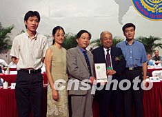 楊煥明、汪建、于軍等七人因完成水稻基因組和建立中國基因組分析基地作出杰出貢獻而獲得了2002年求是"杰出科技成就集體獎"。圖為香港知名人士、實業家查濟民先生(右二)在中國科協學術年會上為獲獎者頒獎。作者:陳雯